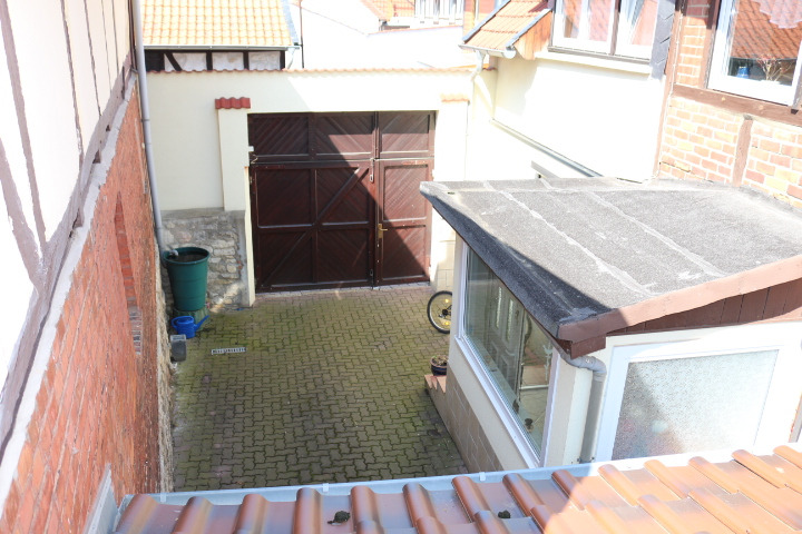 Der abgeschlossene Innenhof bietet Stellfläche für zwei PKW, eine Garage ist vorhanden. Im unteren Bereich der Scheune stehen weitere Abstellmöglichkeiten sowie eine kleine Werkstatt zur Verfügung.